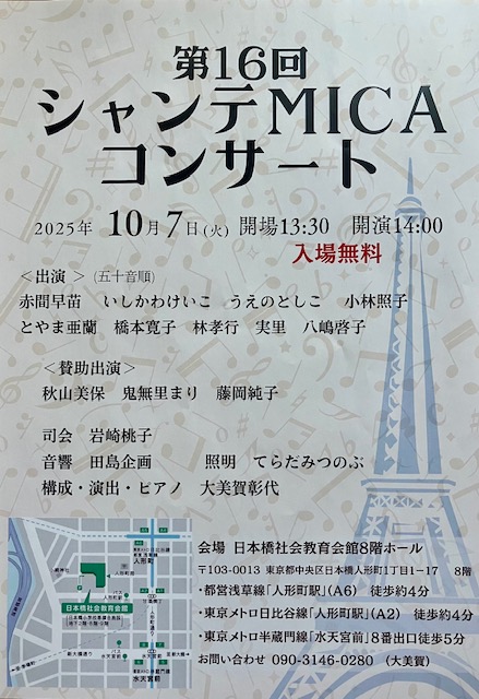 10/7(火)日本橋社会教育会館8階ホールにてシャンテミカコンサート無事終了しました。